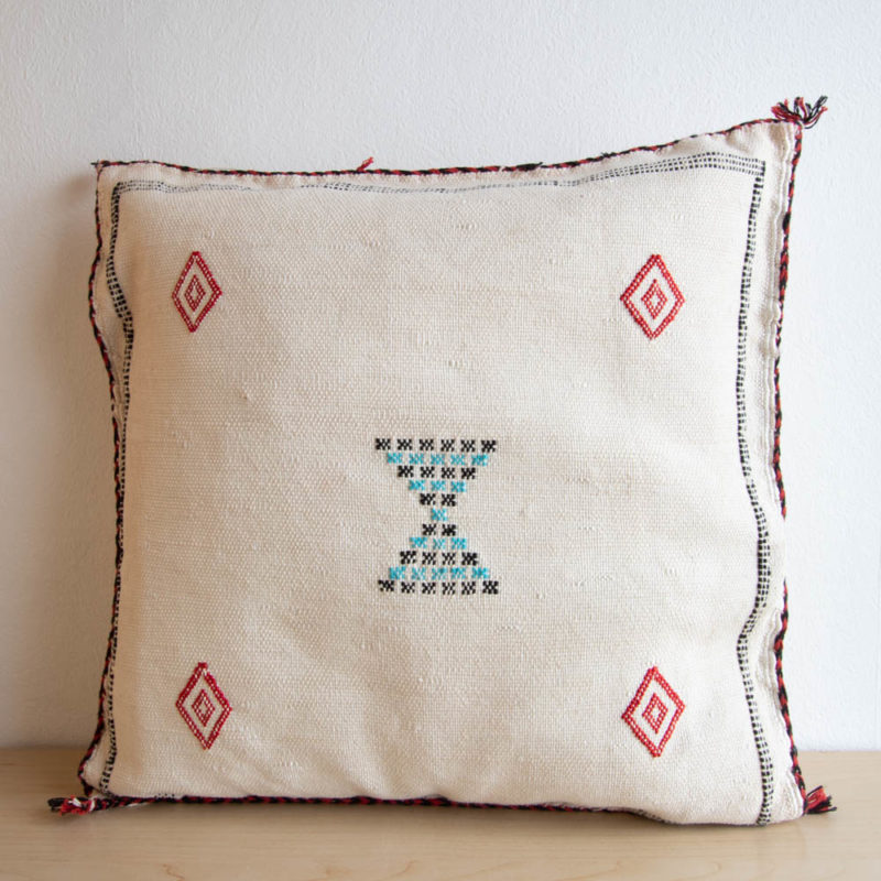 Einzigartiges marokkanisches Sabra Kissen aus Kaktusseide (47cm x 48cm). Kaktus und Seide? Wie soll das zusammenpassen? Die marokkanischen Kissen in dezenten Pastellfarben werden in der Tat aus Kaktusseide gewebt – per Hand versteht sich. Dazu verwenden die Berberfrauen des hohen Atlas Fasern von Agaven verwendet, die in einem aufwändigen Prozess aufgearbeitet und zu einzigartigen Kissen verarbeitet werden. Die Kaktusseide-Kissen sind – jedes für sich – kleine Kunstwerke, die jeden Wohnraum bereichern. Noch dazu kommt der Ausdruck “Seide” nicht von ungefähr, denn die Sabra Kissen sind wirklich unglaublich weich.