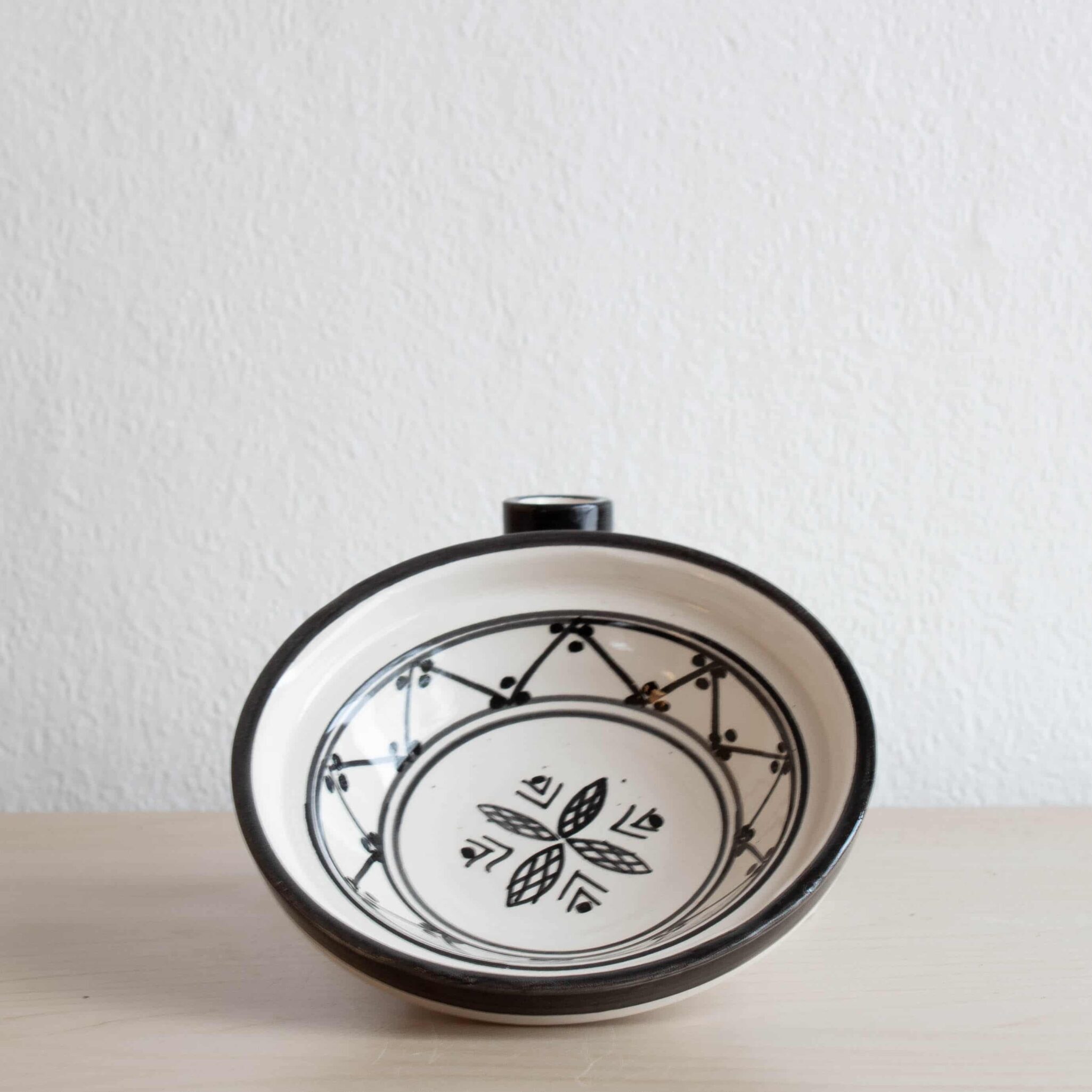 Handgetöpferte und handbemalte marokkanische Tajine SAFI aus der gleichnamigen Region Safi. Die Tajine hat ca. 14 cm Durchmesser und ist auch ungefähr 13 cm hoch. Traditioneller Weise werden in Marokko viele verschiedene Gerichte in diesen Tontöpfen namens “Tajines” zubereitet. Natürlich sind diese Tajines viel größer und besitzen meistens keinen Dekor. Unsere kleinen Vertreter mit den wunderschönen schwarz-weißen Ornamenten eignen sich zwar nicht wirklich zum Kochen, um aber Tapas, Knabbereien oder andere Leckereien zu präsentieren, sind sie einfach toll. Praktisch ist auch, dass man alles, was man in der Tajine aufbewahrt, abdecken kann. Egal ob diese handbemalte Schönheit auf dem Esstisch, im Regal oder einem anderen Wohnbereich zum Einsatz kommt, sie ist in jedem Fall ein absoluter Eyecatcher.